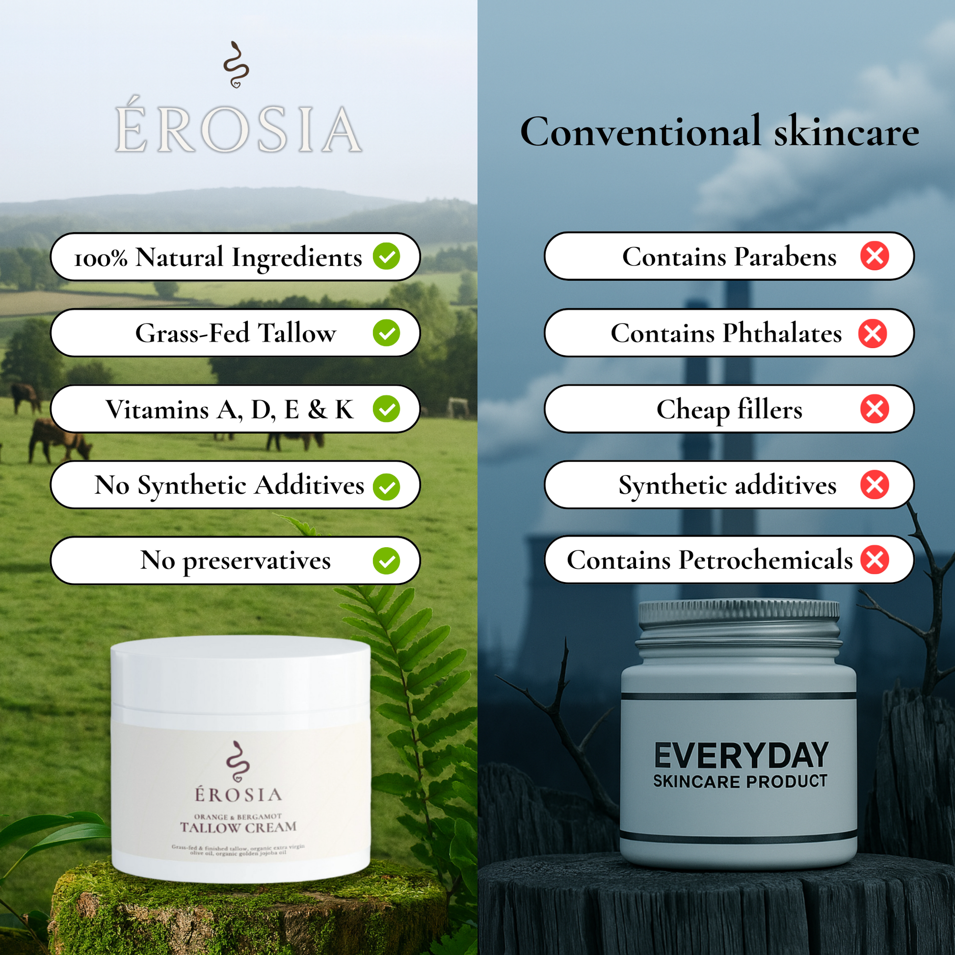 No parabens. No phthalates. No seed oils. No synthetics. No toxins. No gimmicks. ÉROSIA is skincare rooted in nature: clean, calming, and truly body-safe.